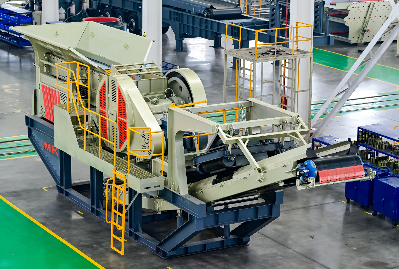 占地空间小,节约用地成本:OM集块式破碎筛分站主机及皮带机等集成在底盘支架上,同时优化了生产线工艺设计,不仅占地空间更小,明显节约场地投资成本,还可根据现场工况变化,随时增减或更换设备,适应不同需求,灵活多样。